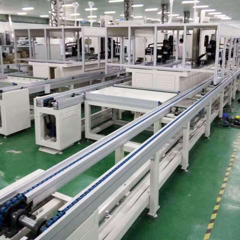 倍速鏈輸送機(jī),其輸送原理是運(yùn)用倍速鏈條的增速功能,使其上承托貨物的工裝板快速運(yùn)行,通過(guò)阻擋器停止于相應(yīng)的操作位置;或通過(guò)相應(yīng)指令來(lái)完成積放動(dòng)作及移行、轉(zhuǎn)位、專線等功能。